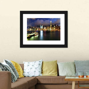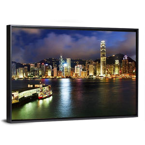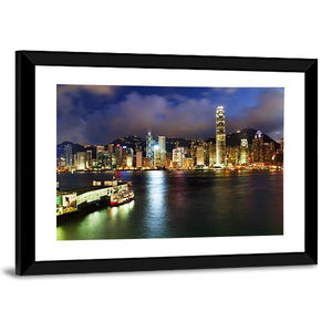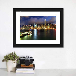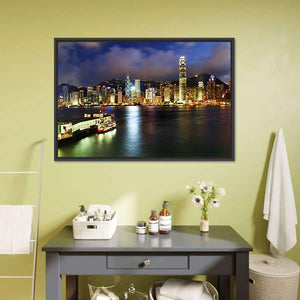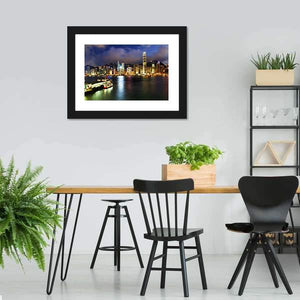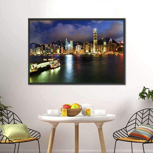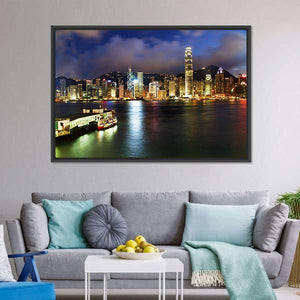 Hong Kong Harbor At Night puts the city skyline and waterfront on display, with piers, boats and tall buildings lit against a night sky and mirrored in the water. The print uses blue, black, yellow and white to convey a vibrant, bustling urban mood that suits modern living rooms and office spaces.