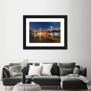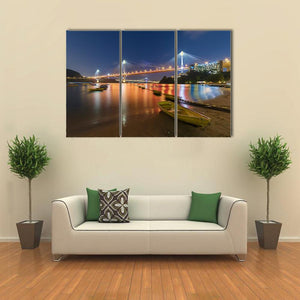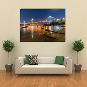 Ting Kau Bridge Canvas Wall Art shows an illuminated suspension bridge with boats along the shore and reflections on calm water. The photorealistic night scene blends deep blues with warm orange highlights for a serene, illuminated mood. Ideal for modern living rooms or offices as coastal-inspired wall decor.