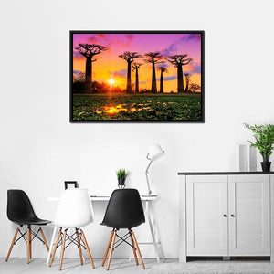 This vibrant canvas art captures the majestic baobab trees at sunset, reflecting the serene beauty of South Africa's fields. The warm hues of orange and purple create a dramatic atmosphere, making it a striking addition to your wall decor.