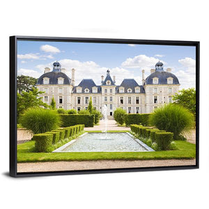 This stunning canvas artwork depicts the grand Cheverny Chateau, surrounded by elegant gardens and a serene fountain. The play of green, blue, and white evokes a peaceful atmosphere, making it a beautiful addition to your home decor.