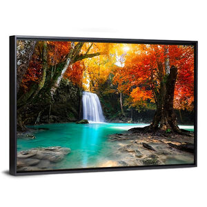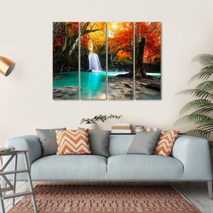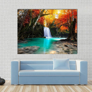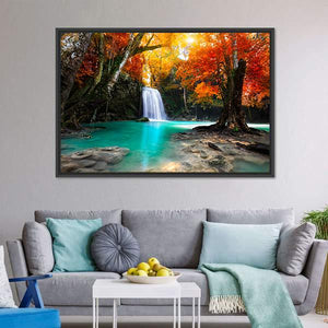 Experience the serenity of a waterfall nestled within a lush forest of autumn trees. This vibrant piece captures sunlight filtering through the trees and a rocky riverbed, creating a natural atmosphere that brings the beauty of nature indoors.