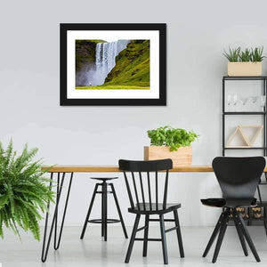 Experience the majestic beauty of Iceland's waterfalls with this striking canvas wall art. The vibrant greens and blues capture the raw energy of nature, while a person stands with arms raised in awe, inviting an adventurous spirit into your space.
