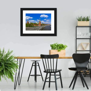 This canvas features a striking view of the Kremlin towers alongside the Moscow River on a sunny day. The vibrant blue sky is dotted with puffy white clouds, while cars line the street and a boat glides by, creating a lively scene.