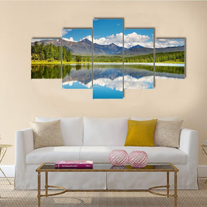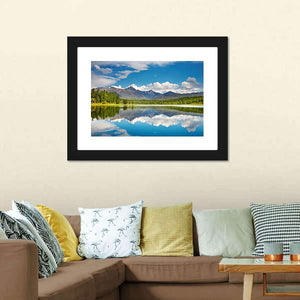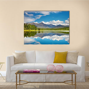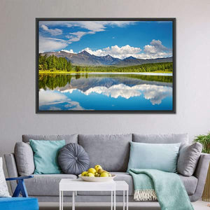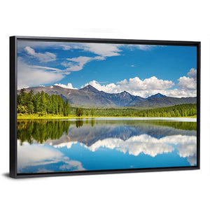 This canvas captures a serene lake scene in the Altai Mountains with snow-capped peaks, dense evergreen forest, white puffy clouds and a perfect reflection in the water. Rendered in blues, greens, gray and white, it brings a calm, majestic mood that suits modern or nature-inspired home room decor.