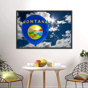 This canvas wall art features a blue balloon with the Montana state seal, embodying a proud and patriotic spirit. The vibrant palette of blue, yellow, green, and white makes it a striking addition to your decor.