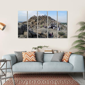 This canvas art captures a busy scene of pilgrimage at Mount Arafat, embodying the spirit of devotion. With a palette of browns, whites, blues, and greys, it features a crowd of people dressed in traditional white garments near a small dome structure on a rocky hill.