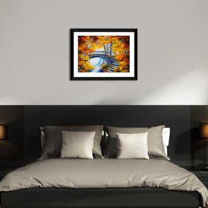 This canvas art beautifully captures a serene scene of an arched bridge framed by vibrant autumn foliage. The rich palette of oranges and yellows evokes the warmth of fall, making it a delightful addition to any nature-inspired décor.