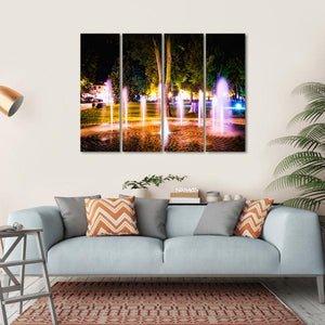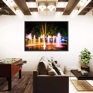 This vibrant canvas captures a serene scene of a dancing fountain surrounded by trees at night. The illuminated water jets bring a magical touch, making it a charming addition to any space.
