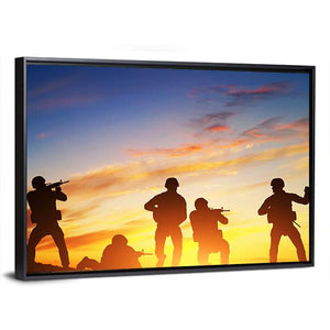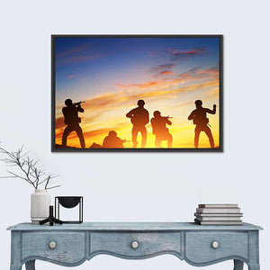 This striking canvas features soldiers in various poses silhouetted against a dramatic sunset sky. The vibrant blue, orange, and yellow hues evoke a heroic and intense atmosphere, perfect for adding a bold statement to your décor.