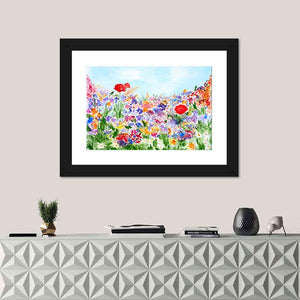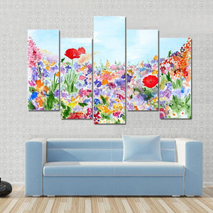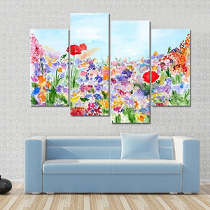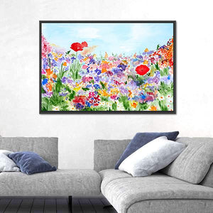 This vibrant canvas captures a field of colorful flowers, showcasing cheerful poppies amidst a lush landscape. With its loose brushstrokes and bright colors, it brings a natural and lively atmosphere to your space.