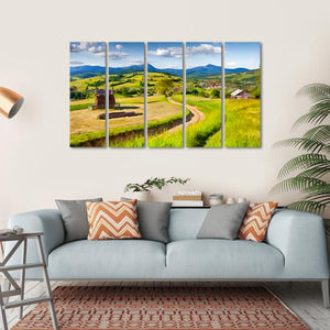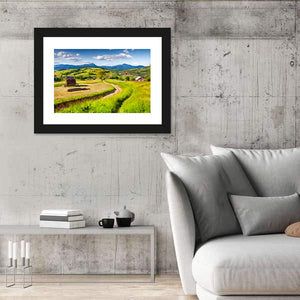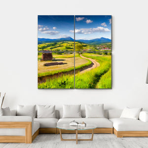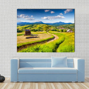 This canvas art captures a serene countryside scene, showcasing a winding dirt road, vibrant fields, and distant mountains under a bright sky. Its impressionistic style and warm colors evoke a peaceful summer day, making it a delightful addition to any nature-inspired decor.