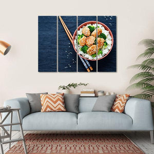 This overhead shot showcases a delicious bowl of teriyaki chicken, rice, and broccoli, accented by chopsticks. Its clean and simple presentation highlights the appetizing colors of white, green, brown, and pink, bringing a modern touch to your home.