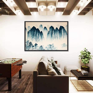 This landscape canvas art features a serene watercolor sketch of high mountains and trees, infused with a tranquil mist. The composition captures a peaceful scene, complete with a lone fisherman in a boat, evoking a sense of calm and reflection.