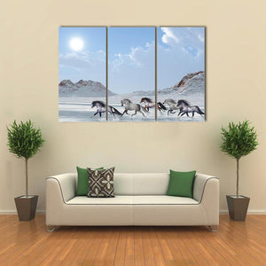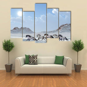 Witness the majestic beauty of five wild horses galloping across a snowy plain, with the sun shining in a vibrant blue sky. This dynamic artwork captures the essence of nature's wild serenity, making it a striking addition to any space.