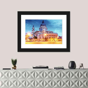 A photorealistic canvas print of St. Stephen Basilica in Budapest, showing the domed silhouette and glowing windows against a blue twilight sky. Its symmetrical composition and grand, historic mood suit modern or architectural interiors that favor illuminated cityscapes.