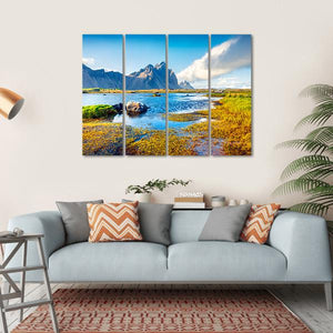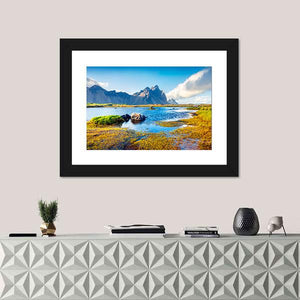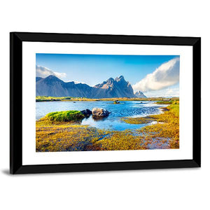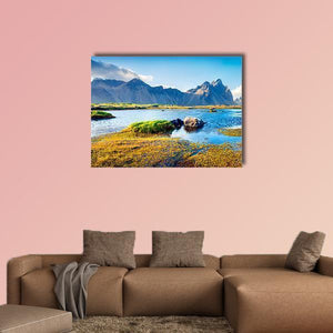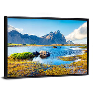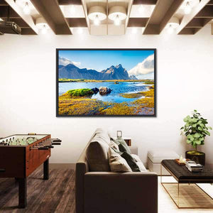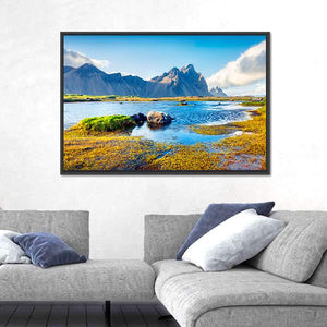 This canvas features the breathtaking Stokksnes Headland in Iceland, showcasing majestic mountains, a serene lake, and lush grass. The realistic portrayal, with striking blue and green tones, brings a calm and tranquil atmosphere to any space.
