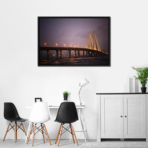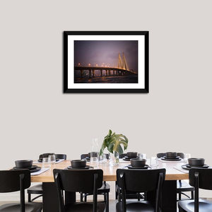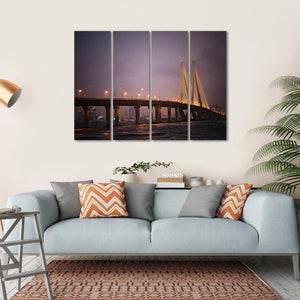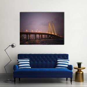 This canvas art features the iconic Bandra-Worli Sea Link, showcasing a striking view of the suspension bridge illuminated by city lights against a dramatic, stormy sky. The rich palette of purple, blue, and yellow brings a moody atmosphere to any space.
