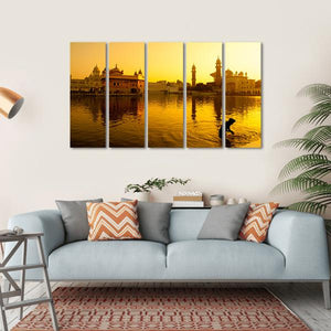 This canvas art captures the serene beauty of the Golden Temple as it reflects on tranquil waters at sunset. A silhouette of a person bathing evokes a spiritual ambiance, making it a peaceful addition to your wall decor.