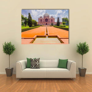 This exquisite canvas print captures the grandeur of the Mughal Emperor Humayun's Tomb, showcasing its elegant domed architecture surrounded by serene gardens and reflective water features. The vibrant palette of red, orange, green, and blue enhances the peaceful ambiance of this landmark, making it a striking addition to any wall space.