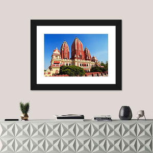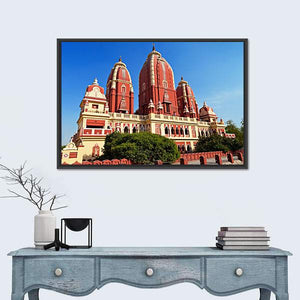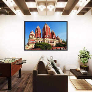 This canvas art beautifully showcases the Laxmi Narayan Temple in New Delhi, highlighting its ornate carvings and majestic domed roofs. The serene ambiance is enhanced by lush greenery and a vibrant palette of red, yellow, blue, and green.