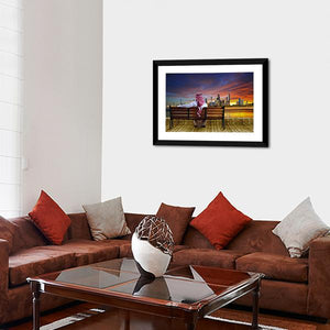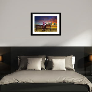 This panoramic canvas depicts a serene scene of a man on a bench, gazing at a colorful city skyline at sunset in Kuwait. The vibrant palette features oranges, blues, and browns, creating a contemplative atmosphere for your space.