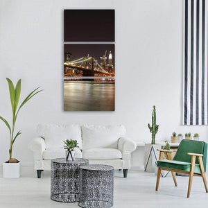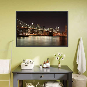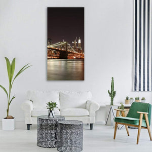 This captivating canvas art features the iconic Manhattan skyline at night, highlighted by the Brooklyn Bridge. The vibrant palette of black, orange, white, and blue captures the urban energy and reflections of city lights on water, making it a striking addition to any room.