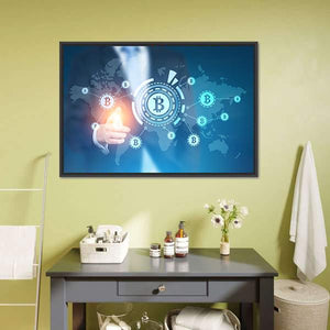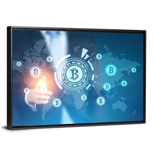 This panoramic canvas centers on a businessman and a glowing bitcoin symbol set against a stylized world map with surrounding network nodes, rendered in blue, white, gold, and black. The modern, abstract digital art piece gives a futuristic, interconnected tech mood and fits a home office or contemporary workspace.