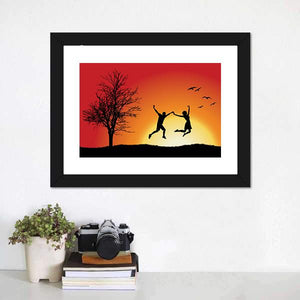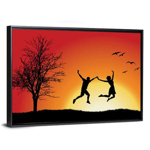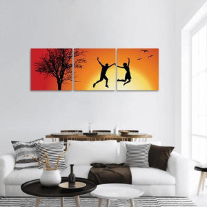 Two silhouetted figures leap beside a bare tree as birds fly across warm reds, oranges and yellows. Rendered in a minimalist, modern silhouette style with a rule-of-thirds composition, the scene feels joyful, energetic and free. Its panoramic, modern look fits contemporary living rooms or workspaces seeking bold, graphic wall decor.