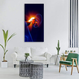 This vertical canvas art features a striking illustration of ear anatomy, emphasizing the inner ear's glowing structure. The abstract design evokes a scientific and dramatic atmosphere, making it a unique addition to any wall decor.