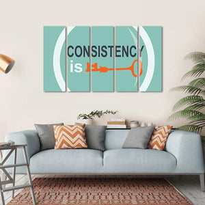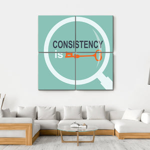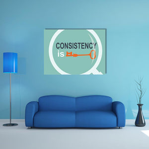 This minimalist typography canvas art features the inspiring phrase 'CONSISTENCY is the key' alongside a key graphic. The refreshing mint green, white, orange, and black palette adds clarity and motivation to any space, making it an excellent choice for modern wall decor.