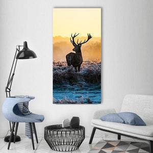 This beautiful canvas features a deer in a serene winter field at sunrise, captured in warm hues of yellow, brown, and blue. Its majestic presence, with large antlers and frosted vegetation, creates a quiet and naturalistic ambiance, perfect for any nature lover's décor.