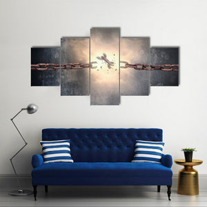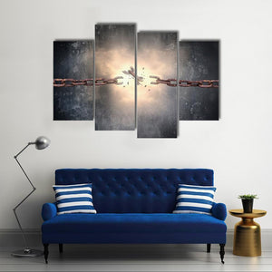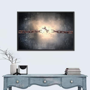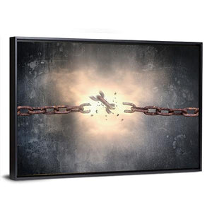 This canvas shows rusted chain links snapping apart with light emanating from the break, suggesting motion and release. The dramatic, symbolic image reads as powerful and speaks of liberation and strength. It works well in modern rooms and motivational spaces like an office or studio.
