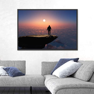 This canvas art features a lone figure standing on a cliff edge, surrounded by vast clouds and a stunning sunset. The dramatic palette of orange, blue, pink, and white creates a serene and contemplative atmosphere.