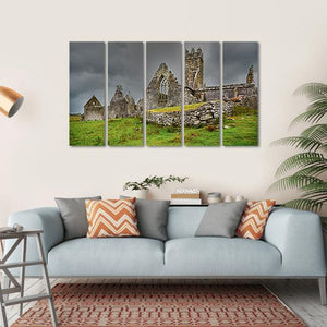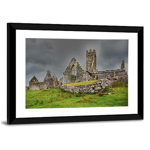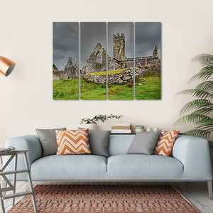 This landscape artwork captures the somber beauty of a ruined stone building nestled in Ireland, showcasing an arched window and a stone tower against a backdrop of grassy hills. The palette of gray, green, and brown evokes a historic and dramatic mood, making it a striking addition to your decor.
