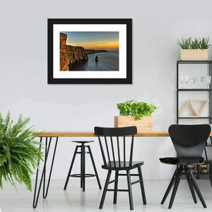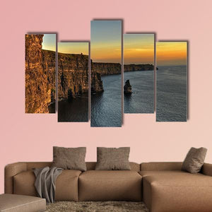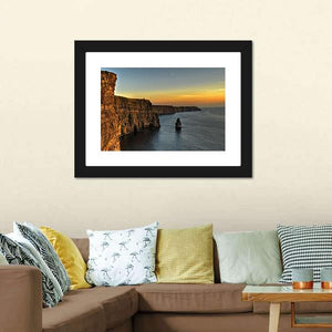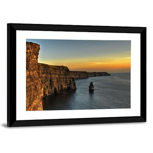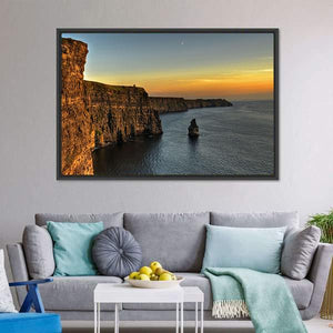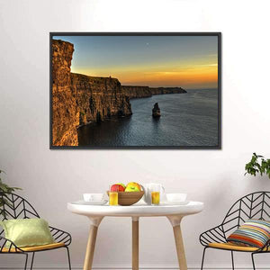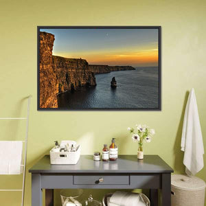 A realistic canvas print of the Cliffs of Moher, featuring rocky coastal cliffs, a distant sea stack and a sunset sky. Warm orange and blue tones create a serene, dramatic mood that fits modern or nature-inspired rooms in the home.