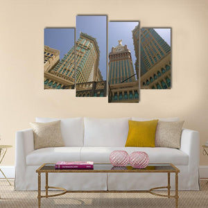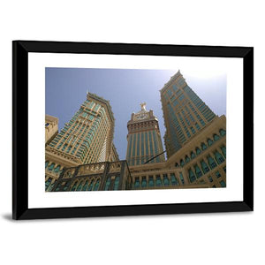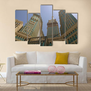 This photorealistic canvas artwork captures the grand architecture of the Mecca Clock Tower, featuring ornate details against a clear blue sky. Its captivating low-angle perspective highlights the impressive skyscrapers surrounding the iconic tower.