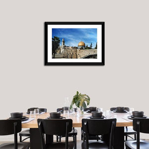 Featuring Jerusalem’s Western Wall with the Dome of the Rock and Al‑Aqsa Mosque, this panoramic canvas captures a serene, historic daytime scene. Photorealistic details — golden dome, minaret, stone structures and palm fronds beneath a blue sky — create a calm, spiritual atmosphere suited to home and devotional spaces.