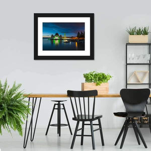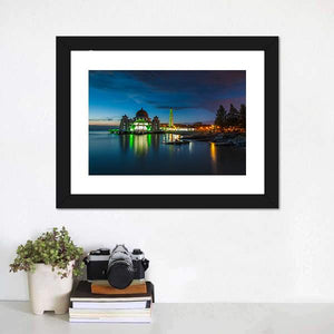 This canvas art features the majestic Melaka Straits Mosque set against a tranquil night sky. With serene blues and greens, it beautifully captures the mosque illuminated in green lights, reflecting on the calm water below.
