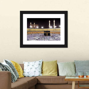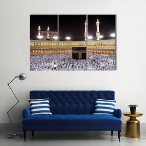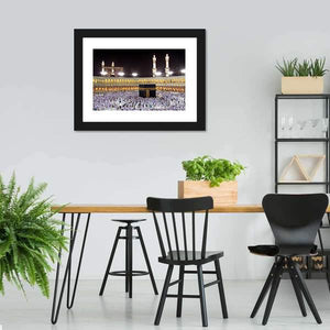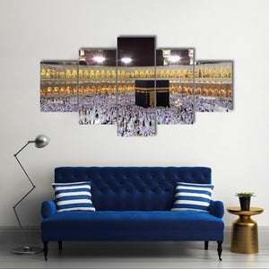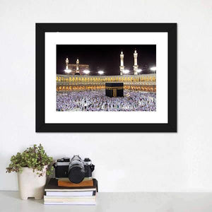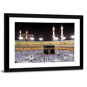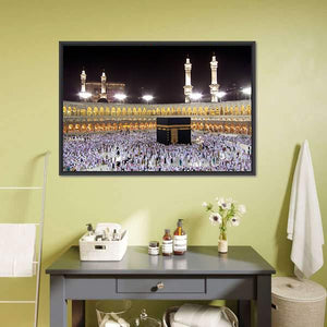 This canvas art captures the Holy Kaaba in Mecca illuminated at night, surrounded by a vibrant crowd. Its dynamic composition and realistic style evoke a sense of devotion and awe, making it a striking addition to any room.