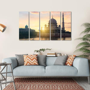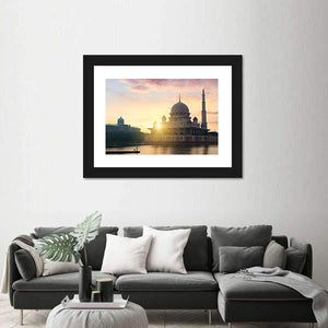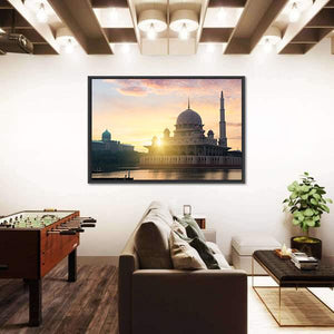 This beautiful canvas art captures the serene ambiance of the Putra Mosque at sunrise, framed by a tranquil lake. With a palette of orange, pink, and blue hues, it evokes a peaceful and majestic atmosphere, making it a striking addition to any wall decor.