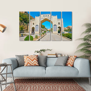 This striking canvas artwork depicts an ancient gateway, beautifully adorned with ornate tiles and set against a serene mountainous background. Its majestic and historical mood enhances any space while celebrating Islamic architecture.