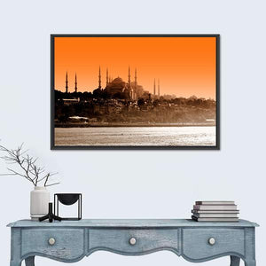 This panoramic canvas captures the Sultan Ahmet Mosque at sunset as a sepia-toned silhouette, with minarets and a historic skyline in warm orange and brown tones. The piece feels serene and majestic and works well in living rooms, studies, or entryways with modern or classic décor.