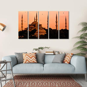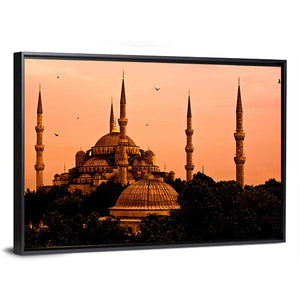 This canvas wall art features the stunning Blue Mosque, known for its multiple minarets and domed roofs, set against a serene sunset backdrop. The warm palette of oranges and browns creates an atmospheric piece that reflects the rich historical and architectural beauty of Istanbul.