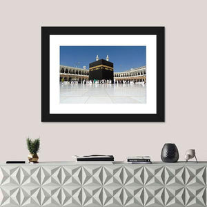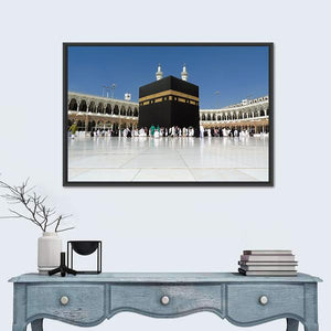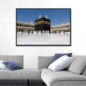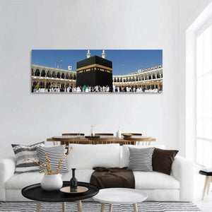 Depicts the Kaaba and Masjid al-Haram in a panoramic, wide-angle photographic print that highlights crowds of pilgrims, minarets, and arched architecture. Its black, white, gold, and blue palette creates a serene, awe-inspiring religious atmosphere. Works well as thoughtful wall decor in a prayer space or modern living room.