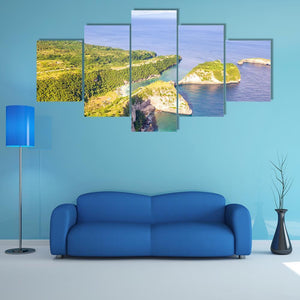 Aerial view of Penida Island, Indonesia, showing a tranquil coastline with clear turquoise water, rocky cliffs, and lush green vegetation. Rendered in a realistic, vibrant style, the scene feels serene and tropical and fits well in coastal or modern room decor.