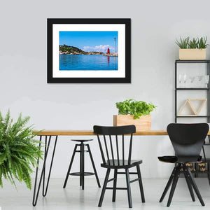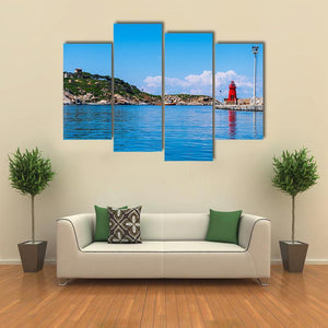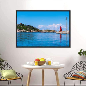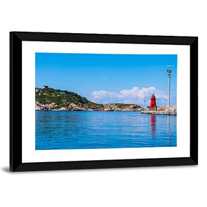 A photorealistic landscape of Giglio Island, Italy centered on a red lighthouse beside calm blue water, with a green island and white clouds arranged with rule-of-thirds balance. The scene feels serene, coastal, and vibrant—well suited to coastal or modern room decor.