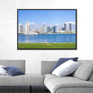 San Diego Skyline From Coronado Island captures the city skyline, a white multi-deck ferry, calm ocean, and a manicured park in a photorealistic view. The image leans on blues, greens, white and grey to create a bright, peaceful urban mood. It fits well in modern homes and living spaces that want coastal city wall art.