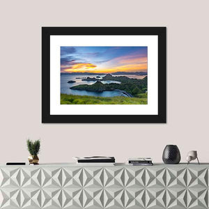 Sunlight From Top Of Padar Island At Sunset shows Padar Island’s grassy hills and calm ocean under a vibrant sunset sky. The realistic landscape pairs serene and dramatic moods with blues, greens and warm sunset tones. Suited to modern home décor.