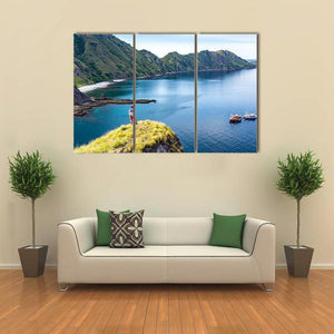 A young hiker stands on a grassy cliff edge, looking out over crashing ocean waves in a realistic coastal landscape. The scene reads both adventurous and serene, with blues, greens and earthy browns that suit modern room decor. Works well in living rooms, entryways, or a study.