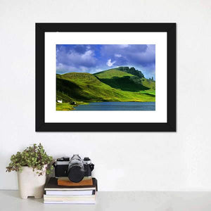 Isle of Skye landscape showing green rolling hills, a calm lake and a small white building beneath a dramatic cloudy sky. The print carries a serene mood and fits modern rooms and living areas as a natural, calming focal point.